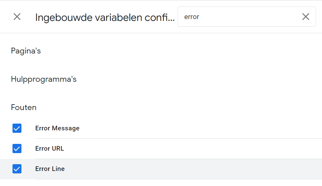 Ga in je GTM-account naar ‘variabelen’ en configureer de ingebouwde variabelen. Zoek op ‘error’ en vink de onderstaande variabelen aan: