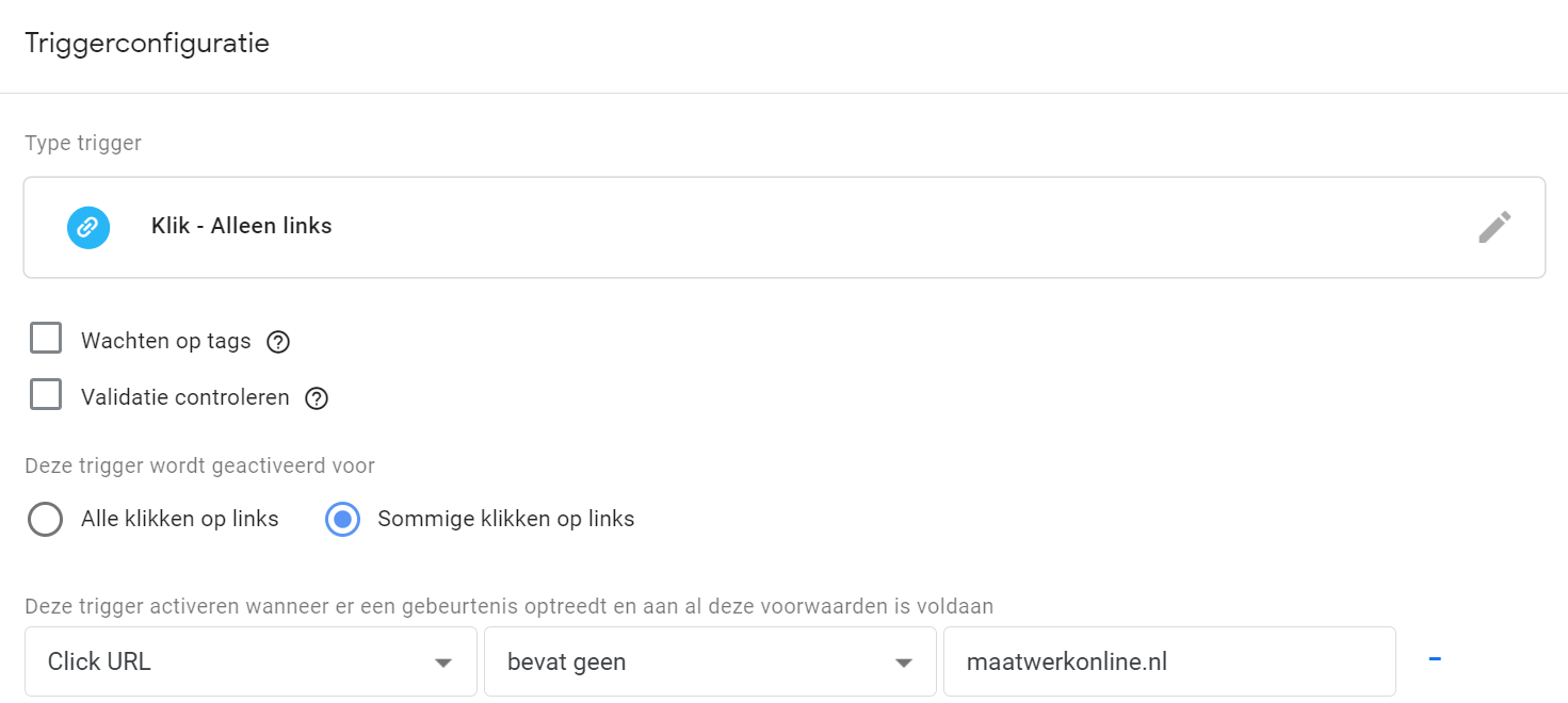 We stellen een trigger in waarbij we klikken op links gaan meten waarvan de URL expliciet niet de eigen domeinnaam bevat. In ons geval willen we dus alle klikken doormeten die niet naar Maatwerkonline.nl doorlinken: