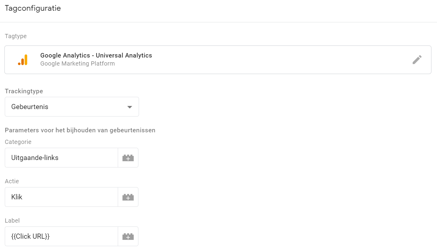 De bijbehorende tag is die van een gebeurtenis naar Google Analytics. Persoonlijk stel ik de categorie daarbij in op ‘uitgaande kliks’. Dit zodat ik in Google Analytics dan alle uitgaande kliks onder één categorie gebeurtenis terug kan vinden. Als label gebruik ik de {{Click URL}} variabele, zodat ik in Analytics ook meteen zie op welke URL er is geklikt: