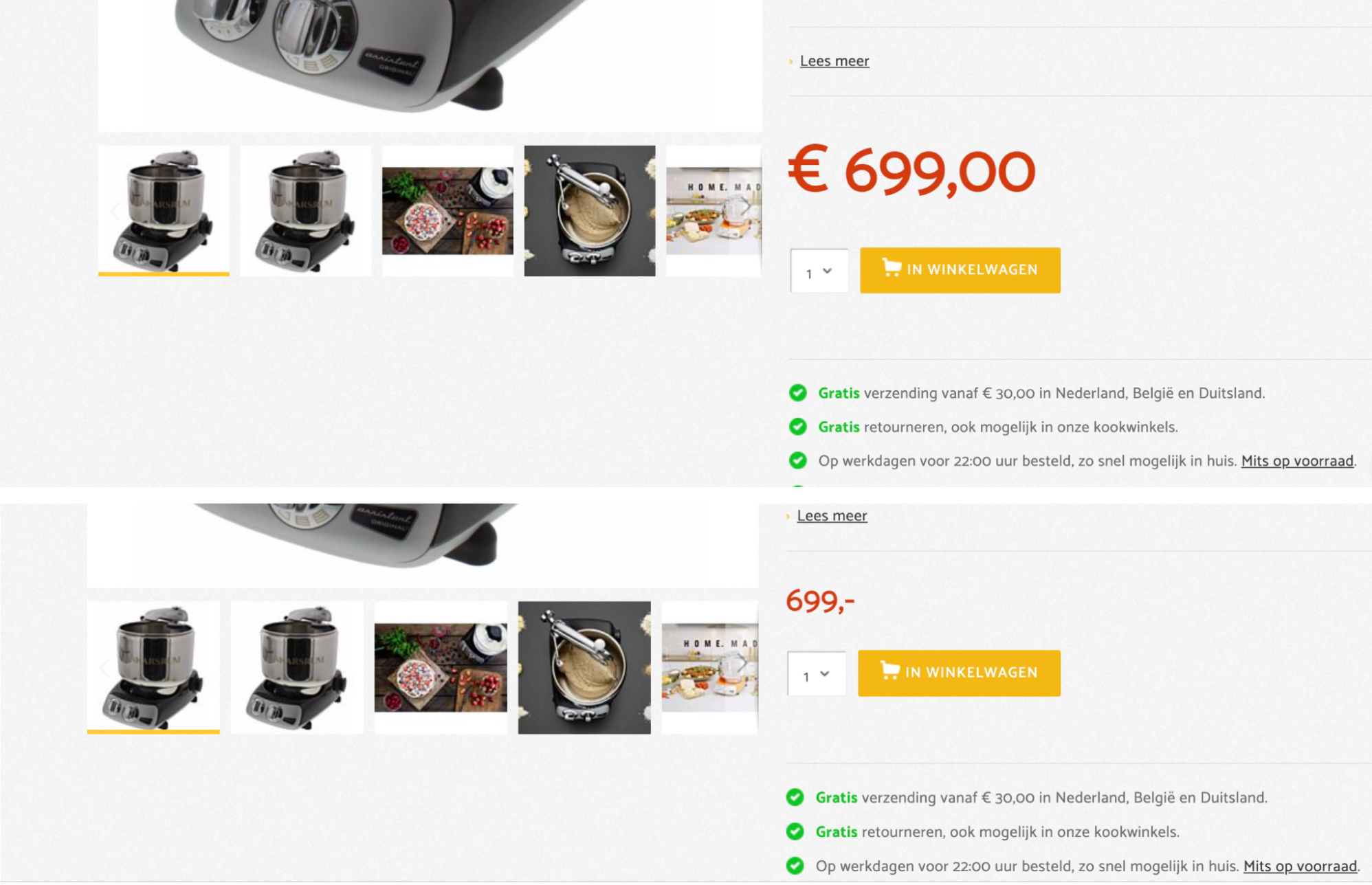 Zo blijkt namelijk dat het zien van een euroteken hetzelfde hersengebied actief maakt als het ervaren van een kleine pijnprikkel. En dit zien we terug in onze A/B tests. Halen we het euroteken weg bij een prijs, dan gaan mensen meer kopen.
