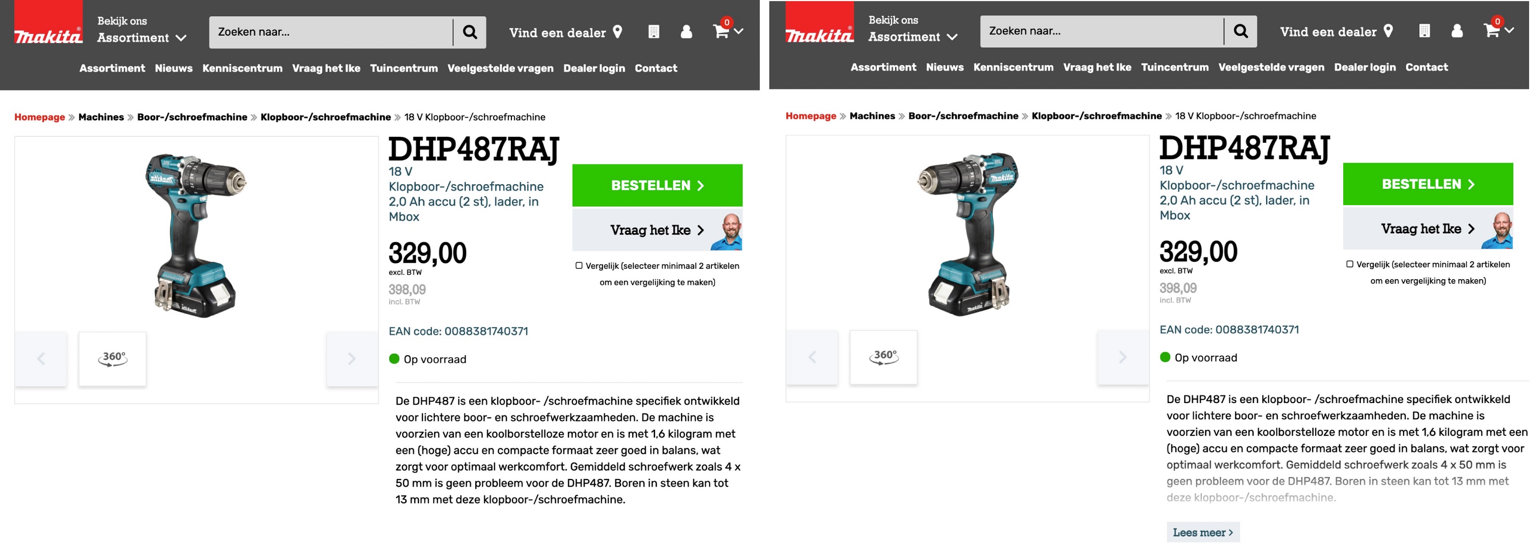 Het antwoord is links. En niet zo’n beetje ook! Waarom? Omdat door deze positionering van de boor de aandacht automatisch gestuurd wordt naar de belangrijkste call to action (bestellen). We zijn namelijk geprogrammeerd om menselijke blikken, pijlen en dus ook producten te volgen. Leuk feitje: Het omdraaien van alle boren op de website van een van onze klanten leverde hen naar verluid 40% meer verkoop op.