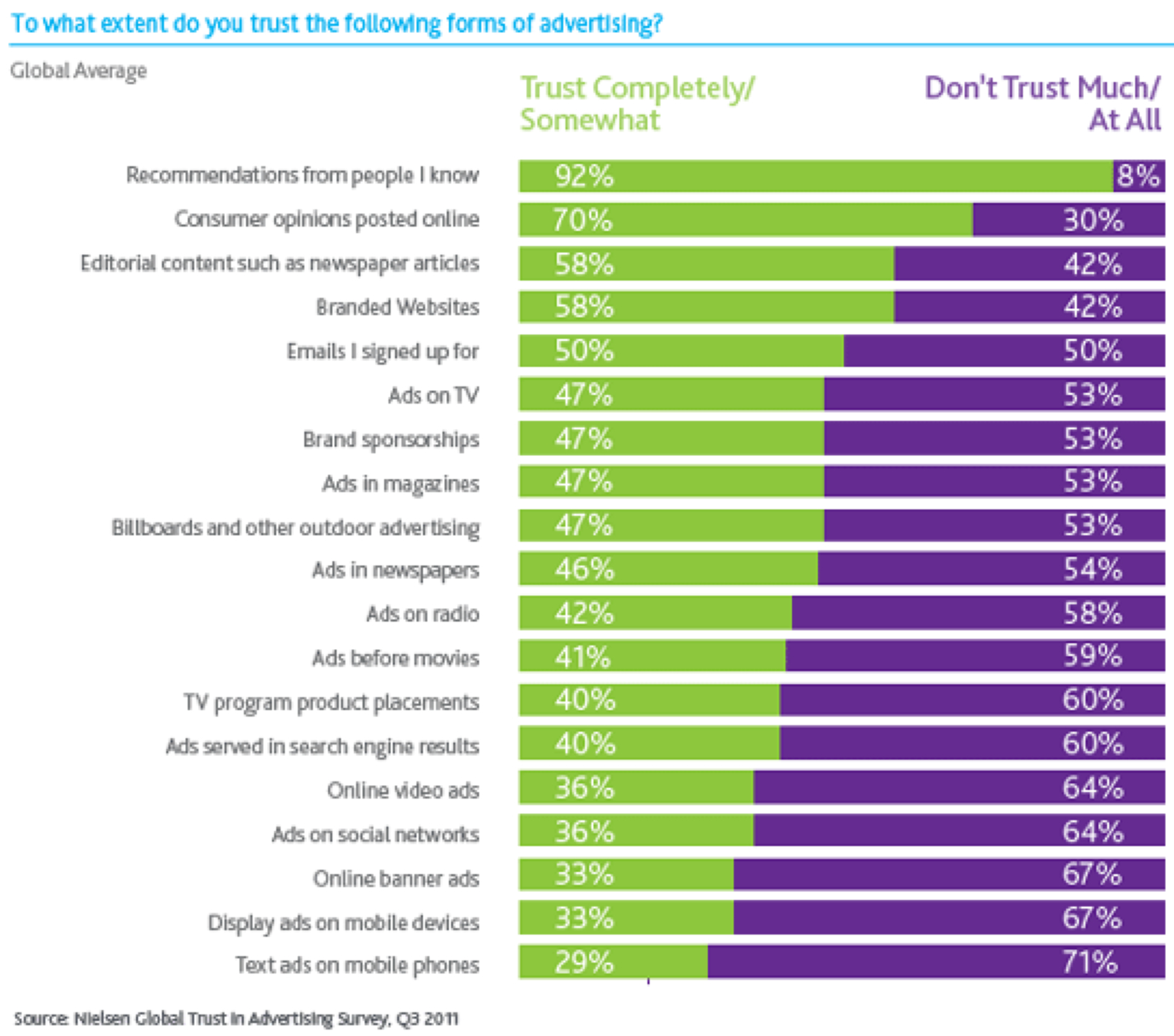 WOM en ook eWOM lijken door consumenten in grote mate vertrouwd te worden als het gaat om betrouwbare informatie over merken. Althans, dat zeggen ze als je het ze direct vraagt. Dat bleek ook uit een vorig jaar door Nielsen (2012) gerapporteerde wereldwijde studie. Men geeft aan merkinformatie van bekenden, maar ook via eWOM, meer te vertrouwen dan bijvoorbeeld advertenties op social media. Nu zeggen consumenten als hen iets gevraagd wordt wel vaker wat, maar vooral de gevonden grote verschillen in de mate van vertrouwen wimpel je niet zomaar weg.