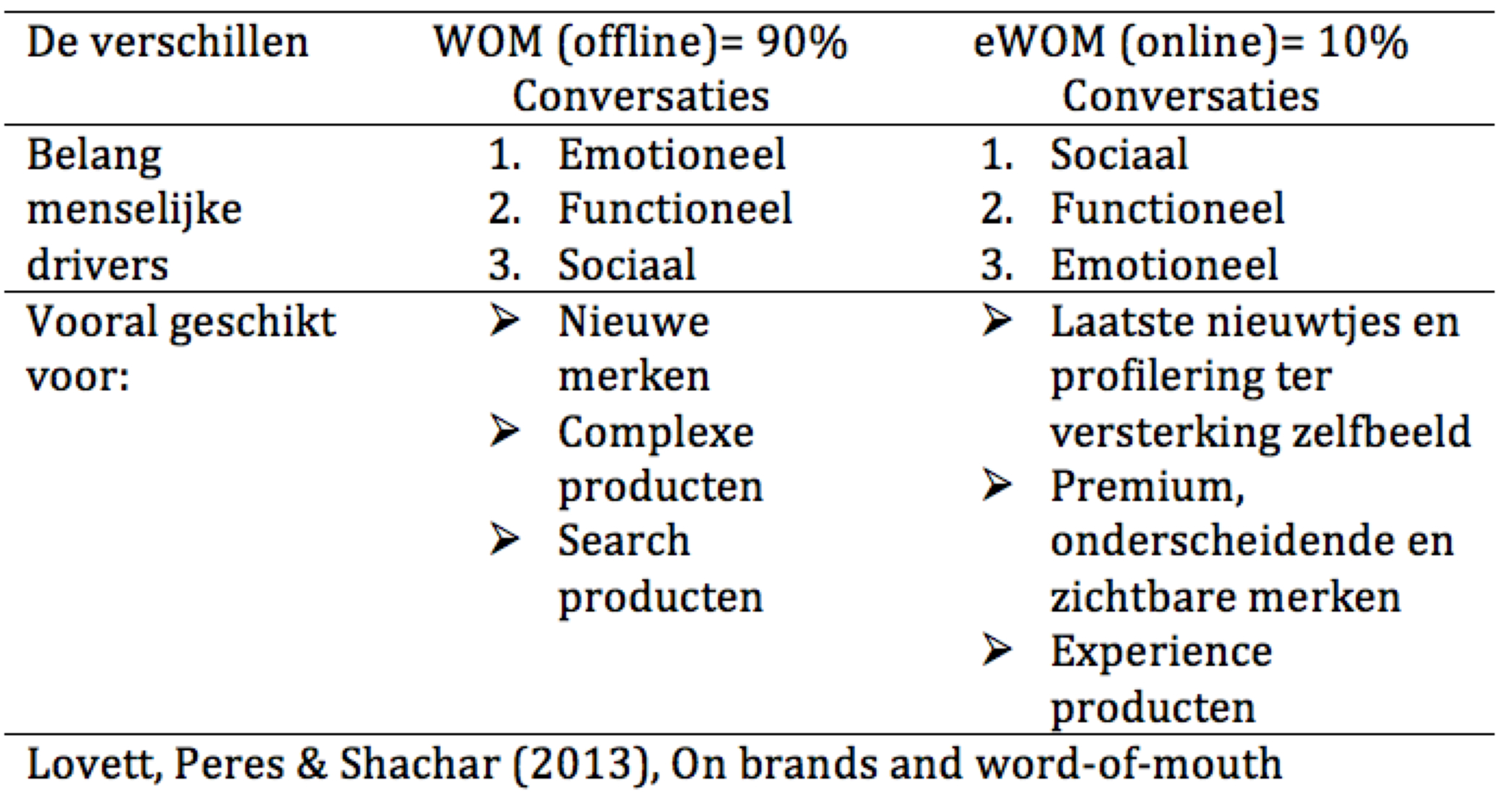 Daarnaast is er een aantal producteigenschappen en -kenmerken die het ene product meer geschikt maken voor WOM en het andere voor eWOM. De verschillen staan aangegeven in het onderstaande overzicht.