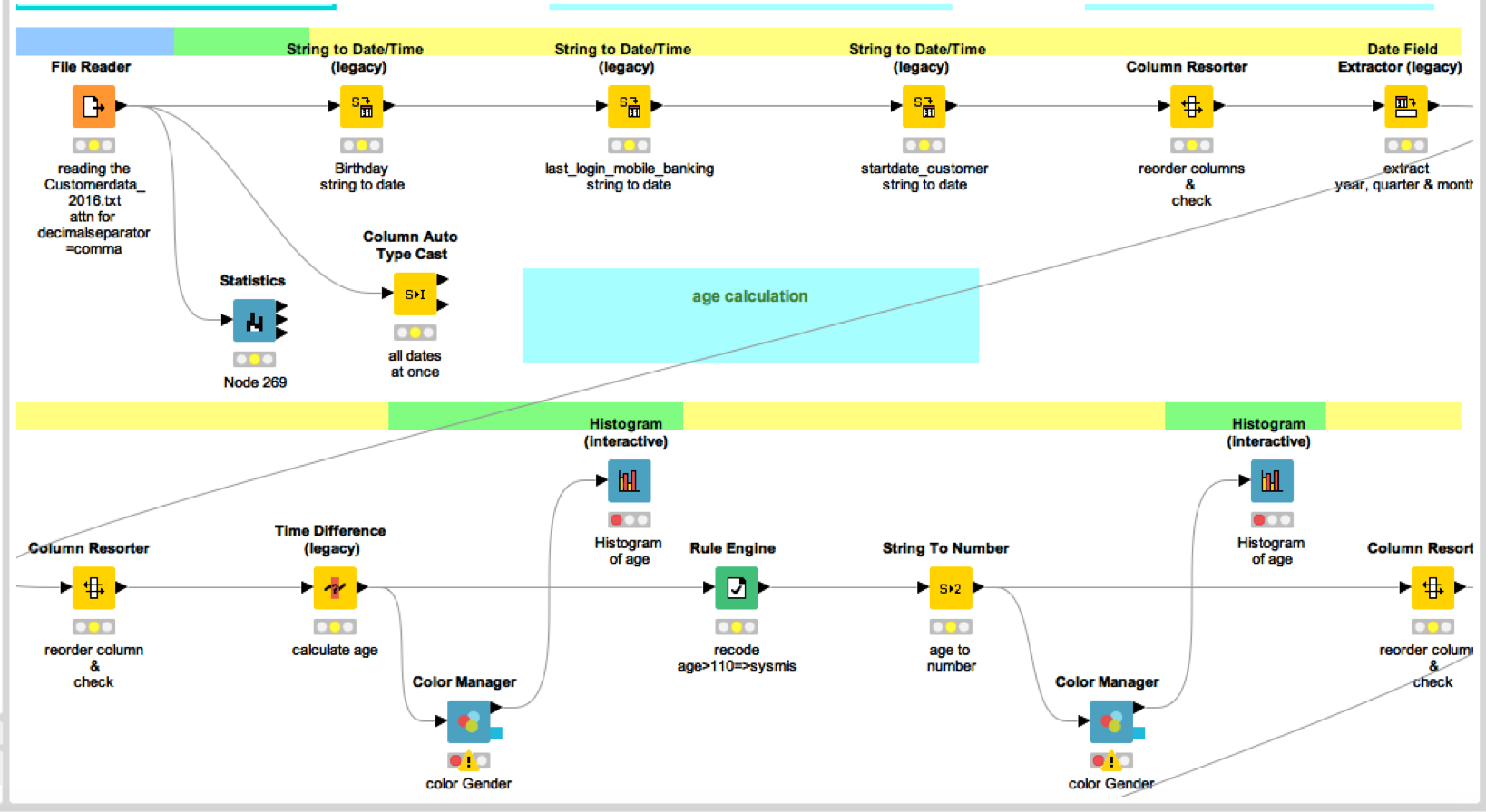Een hele mond vol. Gelukkig is het principe relatief eenvoudig. De software geeft een grafische weergave van het analyticsproces middels een soort flowchart die vaak links begint en rechts eindigt. Acties zijn gegroepeerd in ‘nodes’, een soort knooppunten in het schema waarin een bewerking, procedure of proces plaatsvindt.