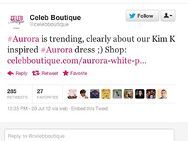 Oeps. Webwinkel Celeb Boutique zag dat de hashtag #Aurora plotseling populair was. Dat leek ze een mooie gelegenheid om hun gelijknamige jurkje in de spotlight te zetten. Dat de hashtag voor voor de schietpartij in de Aurora bioscoop stond, waren ze even vergeten.