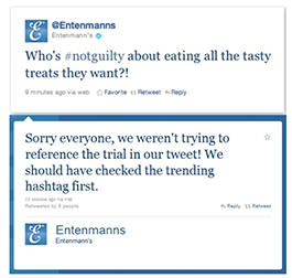 Gebaksfabrikant Entenmanns gebruikte de hashtag #notguilty om te profiteren van een populaire discussie van die dag. Ze waren zich er niet van bewust dat deze hashtag voor de uitspraak in een racistische moordzaak stond.