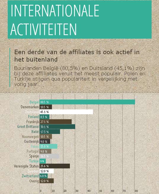 Een derde van de affiliates is ook in het buitenland actief. Dit is een lichte stijging ten opzichte van vorig jaar. Buurlanden België en Duitsland zijn veruit het meest populair. Opkomende landen qua populariteit zijn Polen en Turkije.