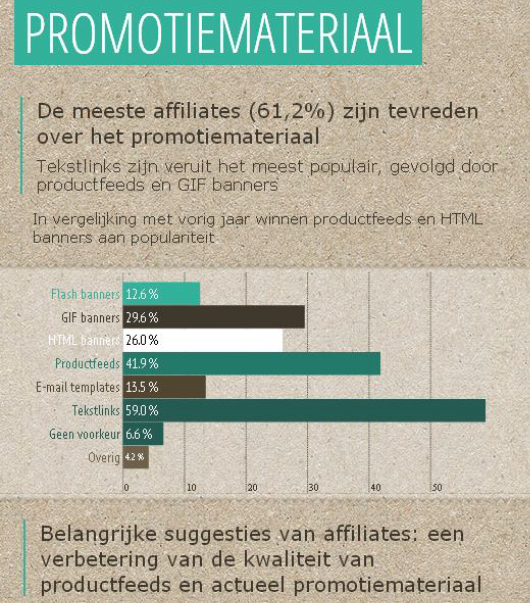 Tekstlinks zijn veruit het meest populair bij affiliates, gevolgd door productfeeds en GIFbanners. In vergelijking met vorig jaar winnen productfeeds aan populariteit bij affiliates. De meeste affiliates (61,2%) zijn tevreden over het promotiemateriaal. Uit de suggesties komt naar voren dat de kwaliteit van productfeeds nog verbeterd kan worden. Daarnaast vinden affiliates het belangrijk dat het promotiemateriaal actueel is.