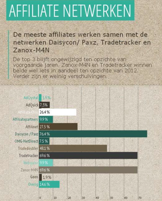 De top 3 affiliate netwerken blijft ongewijzigd ten opzichte van voorgaande jaren, met op de eerste positie Daisycon / Paxzm gevolgd door Tradetracker en Zanox-M4N op een gedeelde 2e plek. Tradetracker en Zanox-M4N winnen beide iets in aandeel ten opzichte van 2012. Opvallend is dat op basis van de meest behaalde omzet Tradetracker op één staat, gevolgd door Daisycon/ Paxz en Zanox-M4N. Net als vorig jaar is Daisycon volgens de deelnemende affiliates het voorkeursnetwerk, maar het verschil met nummer 2 Tradetracker is dit jaar slechts 2 procent.