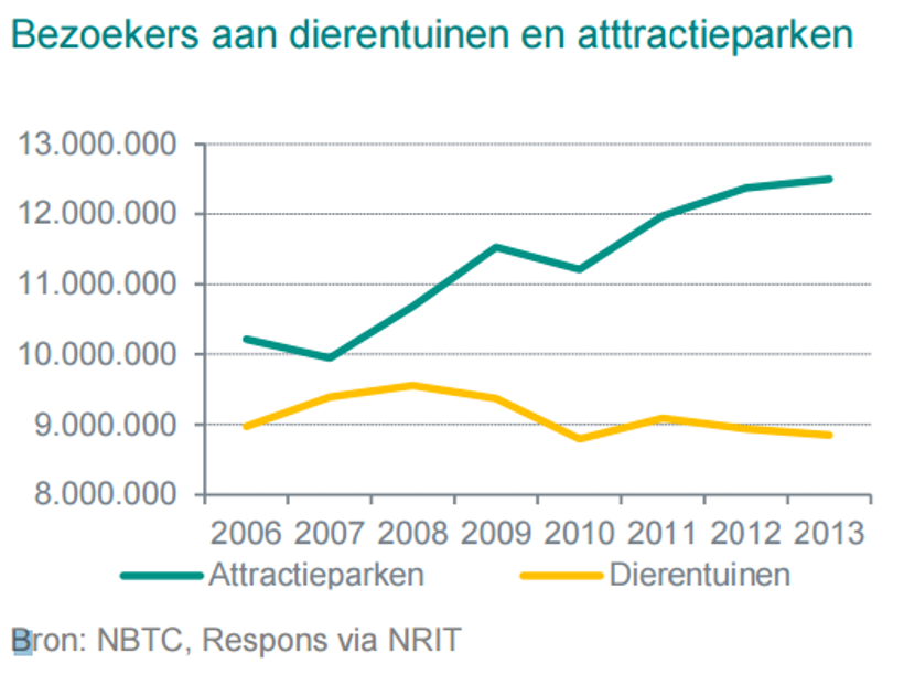 Wanneer je de sector opsplitst in enerzijds attractieparken en anderzijds dierentuinen, valt op dat sinds het begin van de economische crisis het aantal bezoekers van attractieparken fors is gestegen en het dierentuinbezoek , met uitzondering van 2014, daarentegen sterk is gedaald.