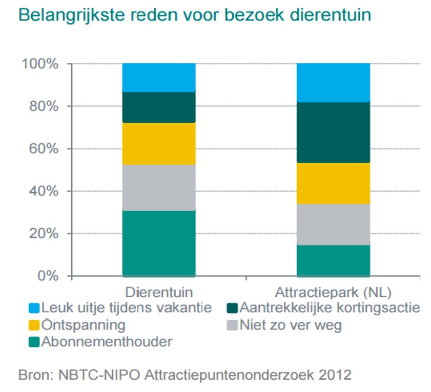 De redenen (zie illustratie) van de consument om een dierenpark te bezoeken, verschilt duidelijk van die om een attractiepark binnen te gaan. Bij dierentuinen ligt zichtbaar meer nadruk op het afsluiten van (jaar)abonnementen en minder focus op het binnenhalen van klanten via kortingsacties (impulshandeling).