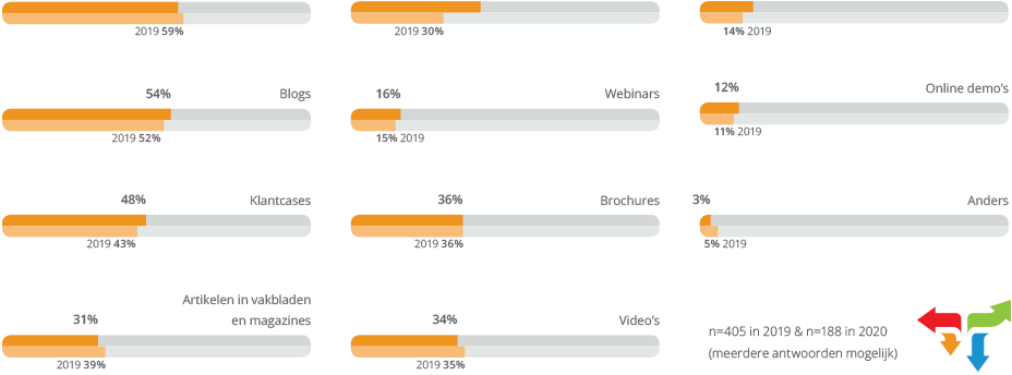 En dat sleutelen aan al die blogs, white papers, brochures e.d. levert ook leads op. De beste leads komen voort uit klantcases (26% in 2020 en 21% in 2019), blogs (19% in 2020 en 18% in 2019) en white papers (19% in 2020 en 18% in 2019). Specifiek voor 2020 constateert het B2B Marketing Trendrapport dat al deze aandacht voor contentontwikkeling deels een andere invulling kreeg na de wereldwijde uitbraak van het coronavirus.