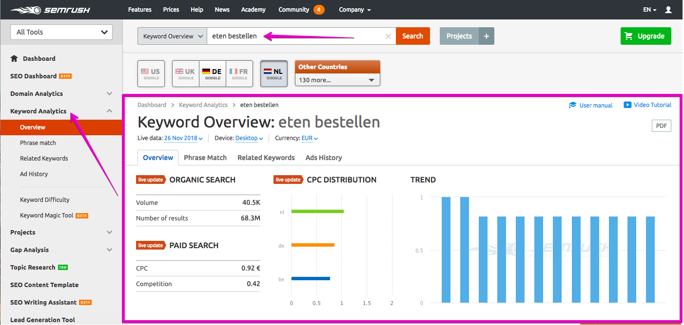 SEMRush is een van de grootste spelers op de markt voor SEO-tools. De service biedt een complete analyse van concurrenten, waaronder een domeinanalyse, trefwoordonderzoek, backlink checker en vele andere. Je kunt je onderzoek beginnen door de concurrentie te onderzoeken voor je belangrijkste zoekterm of door analyse van de website van je belangrijkste concurrent. In het eerste geval moet je Keyword Overview in het menu kiezen en je zoekwoord in het zoekvak typen. Het land voor het onderzoek zal worden gedefinieerd op basis van de taal van de query, maar je kunt het ook handmatig uit de lijst kiezen. Wat je in het eerste analysescherm te zien krijgt, is de algemene informatie over het zoekwoord: het volume, het aantal pagina’s in de zoekresultaten, de kosten in Google-advertenties, enzovoort.