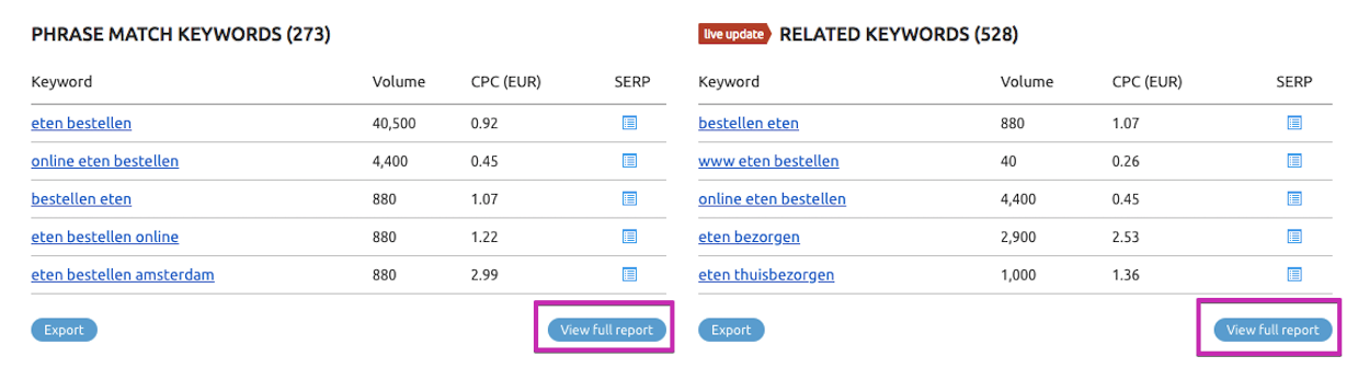 - welke specifieke zoekwoorden worden gebruikt voor organisch en betaald zoeken (je kunt verder gaan en een volledige lijst met zoekwoorden bekijken door op de knop ‘Gedetailleerd rapport weergeven’ te klikken)