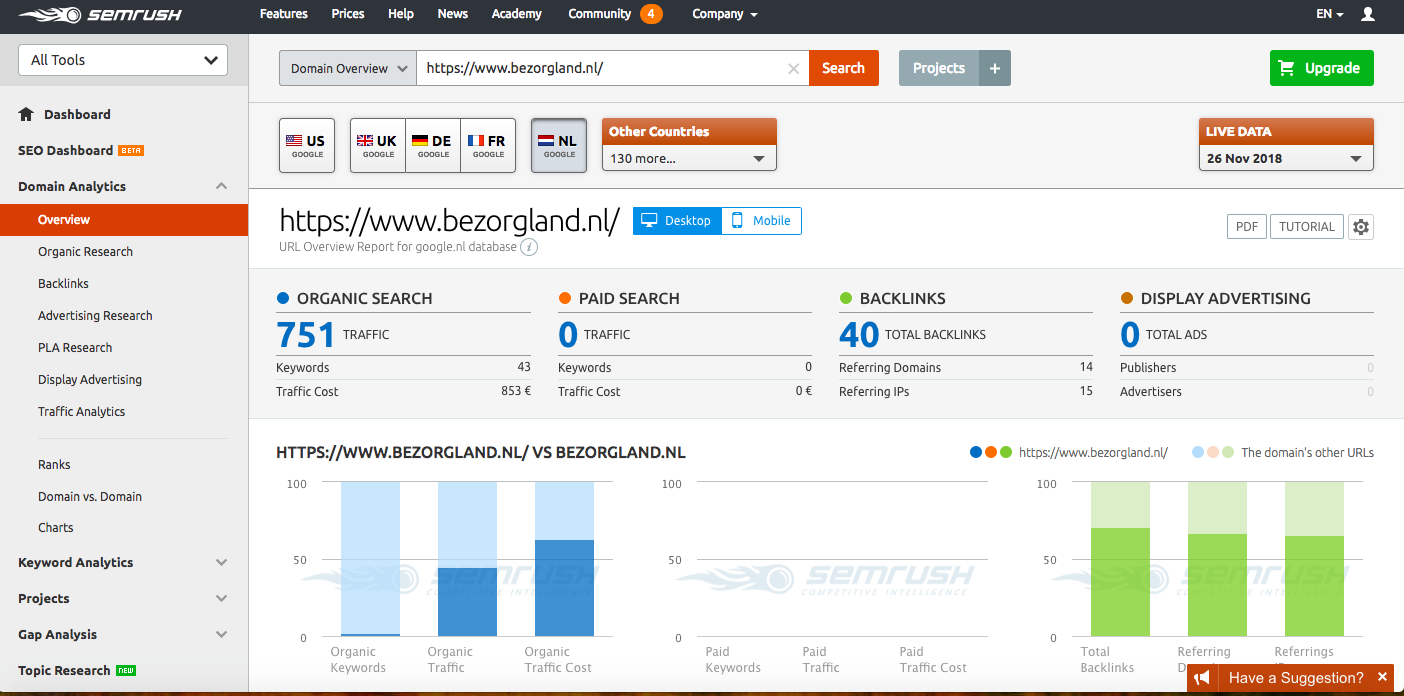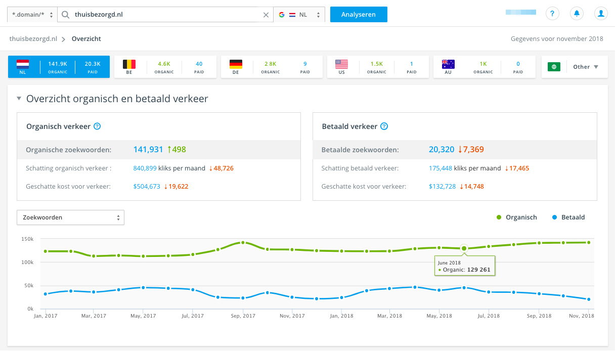 - Voor elk domein krijg je gegevens over het organische en betaalde verkeer: hoeveel zoekwoorden worden voor elk verkeerskanaal gebruikt wordt en hoeveel het kost. Met deze informatie kun je potentieel verkeer en uitgaven in campagnes met Google-advertenties inschatten.