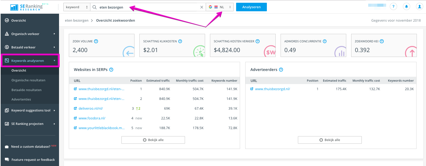Optie 1 – analyse van zoekwoorden. Voer een trefwoord in waarvoor je de concurrentie wilt controleren: