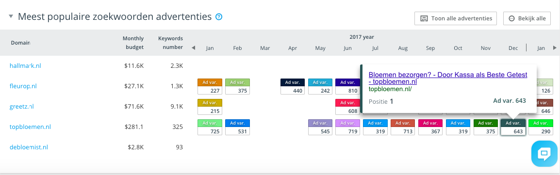 De hoeveelheid en de nauwkeurigheid van de beschikbare gegevens zijn afhankelijk van de niche die je onderzoekt en van het land. Verrassend genoeg weet SEMRush niets van de zoekterm ‘bloemetje bezorgen’, terwijl SE Ranking een volledige analyse geeft en het volume definieert als 27K (dat is best veel). In vergelijking met andere tools heeft SE Ranking de grootste trefwoorden database voor Nederland. Maar nogmaals, de efficiëntie van de gegevens kan variëren, afhankelijk van de niche die je analyseert.