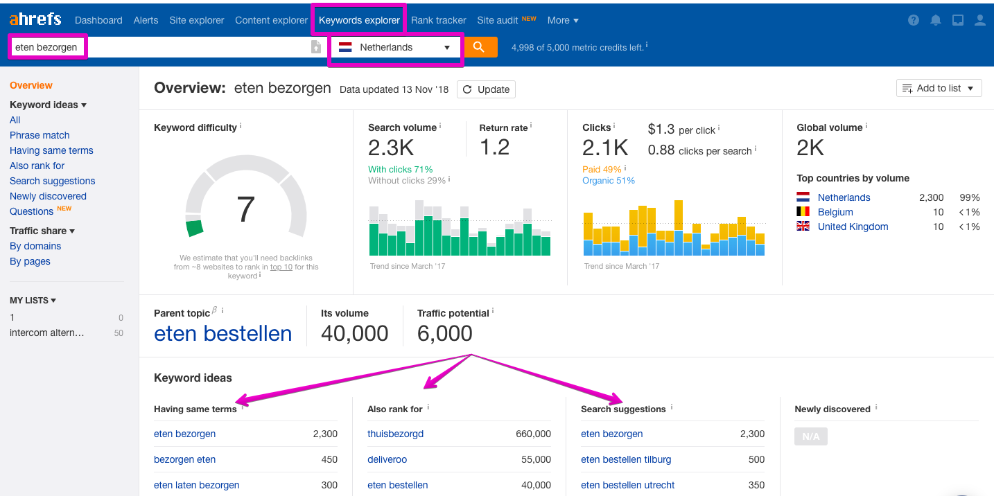 Een ander hulpmiddel om te proberen is Ahrefs. Het is beroemd om zijn backlink-checkermodule, maar kan ook worden gebruikt voor een concurrentenonderzoek. De procedure is ongeveer gelijk aan die in SEMRush en SE Ranking. Kies waarmee je wilt starten: een trefwoord- of domeinoverzicht en kies vervolgens de bijbehorende tool. Voor een zoekwoordonderzoek is het de Keyword Explorer, voor een domeinanalyse is dit de Site Explorer. Voer vervolgens een zoekwoord (of een domein) in dat je wilt onderzoeken en kies vervolgens het land van zoeken: