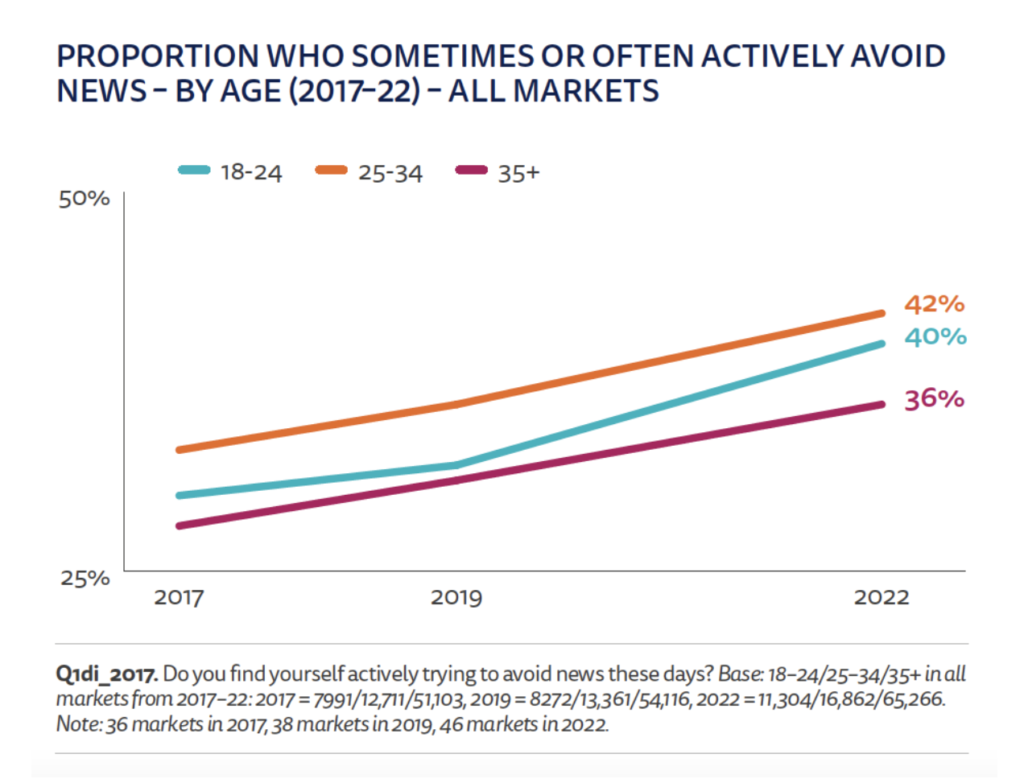 Mediaorganisaties over de hele wereld kunnen het over één ding eens zijn: jonge mensen zijn steeds moeilijker te bereiken en te betrekken als het gaat over nieuws. Met behulp van gegevens uit het Reuters Institute Digital News Report (2022) zien we dat een jonger publiek het nieuws steeds vaker op een andere manier consumeert en er anders over denkt dan een ouder publiek. Ze zijn meer casual nieuwsgebruikers, vertrouwen meer op sociale media en zijn minder verbonden met (en dus minder loyaal aan) nieuwsmerken. Ze hebben ook verschillende percepties van wat nieuws is en hoe het wordt toegepast. Veel van deze verschuivingen zijn zo fundamenteel dat het niet waarschijnlijk lijkt dat ze in de loop van de tijd zullen worden teruggedraaid. Lees hier de analyse van NiemanLab.