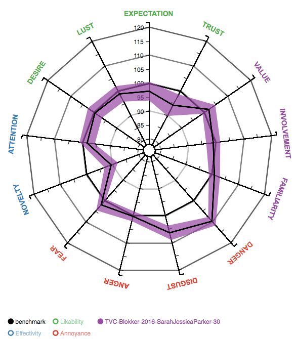 Er worden vijftien onbewuste emoties gemeten, die relevant zijn voor koopintentie. Logischerwijs moeten de positieve emoties hoog staan en de negatieve in de regel laag, wil er sprake zijn van ‘approach’. Bij deze commercial gaat het fout bij het vertrouwen, dat meer dan gemiddeld laag is. Maar nog interessanter is dat de commercial vooral gevaar en afkeer activeert.