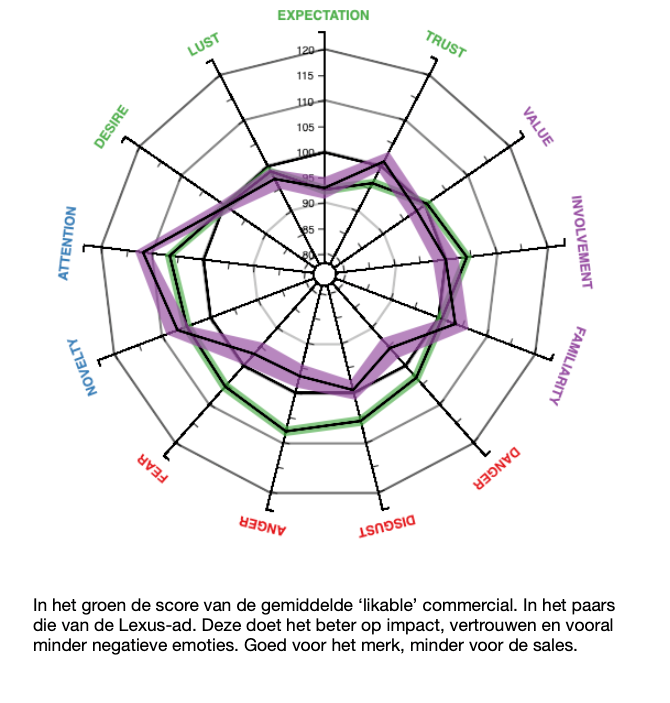 In onze studie scoort de Lexus-commercial vooral erg goed op ‘likability’, zeg maar de gemiddelde Gouden Loeki. En dat verbaast ons eigenlijk niets. Wie het gemiddelde effect van tientallen prijswinnende commercials in één uiting kan vangen, kan er bijna niet naast zitten. De spider-grafiek laat zien waar dat vandaan komt. Veel aandacht en verrassing, en goed van vertrouwen, maar vooral weinig negatieve emoties. Maar ja.., de correlatie met effectiviteit is negatief, of beter gezegd: hij doet niet bijzonder veel voor de verkoop van de auto. En dat is uiteindelijk waar reclame voor bedoeld is.