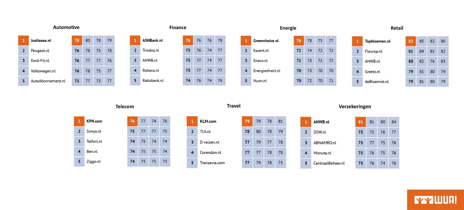 In het volledige rapport hebben we een leeswijzer opgenomen. In ieder geval geldt de beperkende voorwaarde dat om in de lijst voor te komen als marktpartij, die partij minimaal gevonden moet worden tijdens een van de onderzoeken. Doen wij bij WUA bijvoorbeeld géén onderzoek naar de online oriëntatie op de aankoop van een laptop in de genoemde onderzoeksperiode, dan is de kans dat je als laptopshop (of Coolblue) gevonden wordt zéér klein.