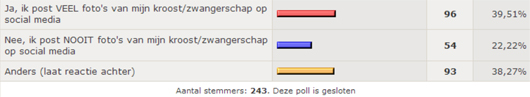 Hoewel ik geen ‘echte’ onderzoeken uit Nederland heb gevonden, stuitte ik wel op een uitgebreide thread over de Britse onderzoeken op Nederlandstalig forum zwangerschapspagina.nl. De resultaten van de poll geven een iets minder extreem beeld dan de Britse getallen. Uit de comments blijkt wel dat de beweegredenen vergelijkbaar zijn: trots en anderen op de hoogte houden.