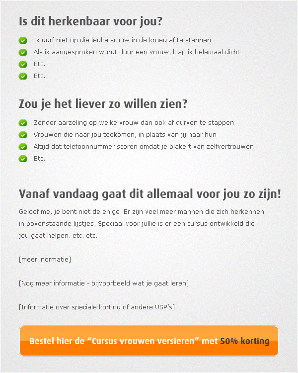 Omdat dit gedeelte ontzettend belangrijk is, hier een voorbeeld. Stel we promoten een cursus ‘vrouwen versieren’ (ja, dat bestaat echt en er zijn affilates voor). Het is dan onze taak om ze naar de salesknop “toe te praten”. Wij willen dat onze bezoeker door het lezen van ons artikel denkt “Ik moet dit nú hebben!”. Hieronder een voorbeeld hoe je het artikel zou kunnen vormgeven: