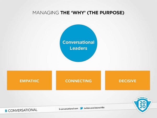 In de eeste plaats is er nood aan een nieuw type leiderschap. De nieuwe leider zijn kerndoelstelling is het managen van de why. De nieuwe leider managet vooral de bestaansreden en langetermijnvisie van het bedrijf. Daarnaast typeren drie aspecten de conversational leader: