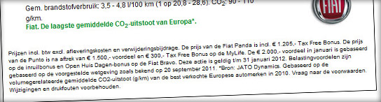 In de footer van Fiat worden alle voorwaarden van de actie opgesomd inclusief voorbehouden op drukfouten.