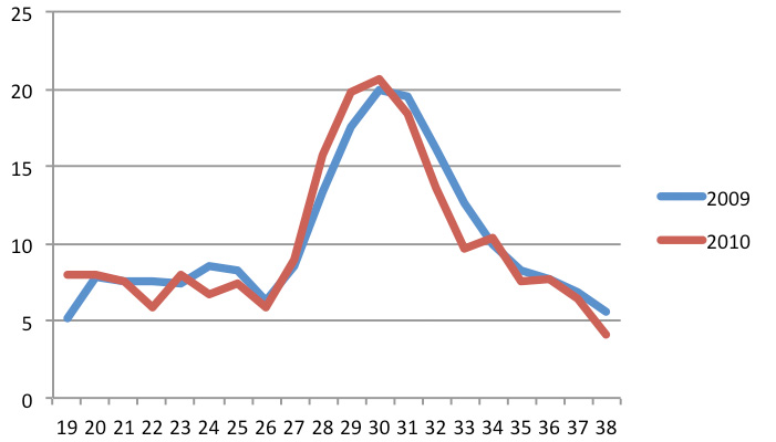 Als je een streep trekt bij 10 miljoen vakantiedagen, dan is ‘de massa’ van week 28 t/m 33 dus niet aan het werk. De echte zware piek ligt in week 29 t/m 32: de traditionele 3 weken vakantie van de bouwvak.
