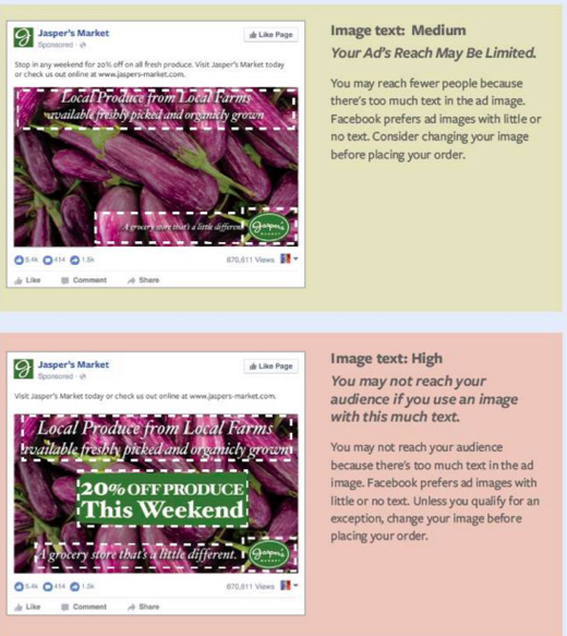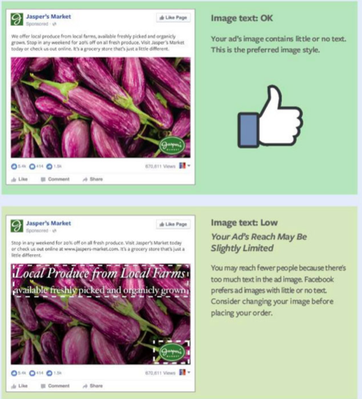 “To help advertisers achieve their business goals while providing people with an enjoyable experience on Facebook, we’ve had a policy limiting excessive text (more than 20%) on images in ads.” (Bron: Facebook Business Update)