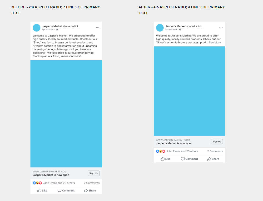 Er zijn ook een aantal mogelijkheden verdwenen. Zo is het inzetten van advertenties in een 2:3-formaat niet langer mogelijk. Deze worden nu (automatisch) afgesneden naar 4:5 om meer uniformiteit op de platformen te genereren. Daarnaast zijn de regels met betrekking tot zichtbare primaire tekst veranderd. Waar we voorheen aan een aantal tekens gebonden waren, worden er nu standaard drie regels aan tekst vertoond. Het hangt dus van de plaatsing af hoeveel tekst zichtbaar is. Facebook geeft aan dat deze aanpassingen beter passen bij het nieuwe design, dat eerder dit jaar geïntroduceerd werd.