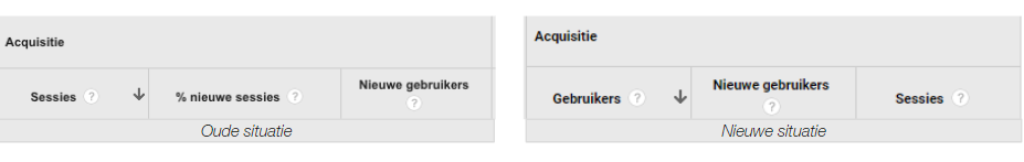 Waar voorheen in de meeste standaard rapporten sessies de eerste metric was die je zag, wordt dit nu gebruikers. De focus van de rapporten wordt dus nu meer gelegd op gebruikers dan sessies. Kijk je bijvoorbeeld naar taal, dan kijk je niet langer naar het aandeel Nederlands sprekende bezoeken/gegroepeerde interacties op je site, maar naar het aantal Nederlands sprekende bezoekers van je website. Met gebruikers als metric kun je de engagement van bezoekers op je website beter analyseren, met name voor de bezoekers die meerdere sessies op één dag hebben. Sessies schuiven simpelweg een stukje op, waardoor je in één oogopslag ziet of een groot gedeelte van je bezoekers meerdere malen per dag/week/maand op je site komen.