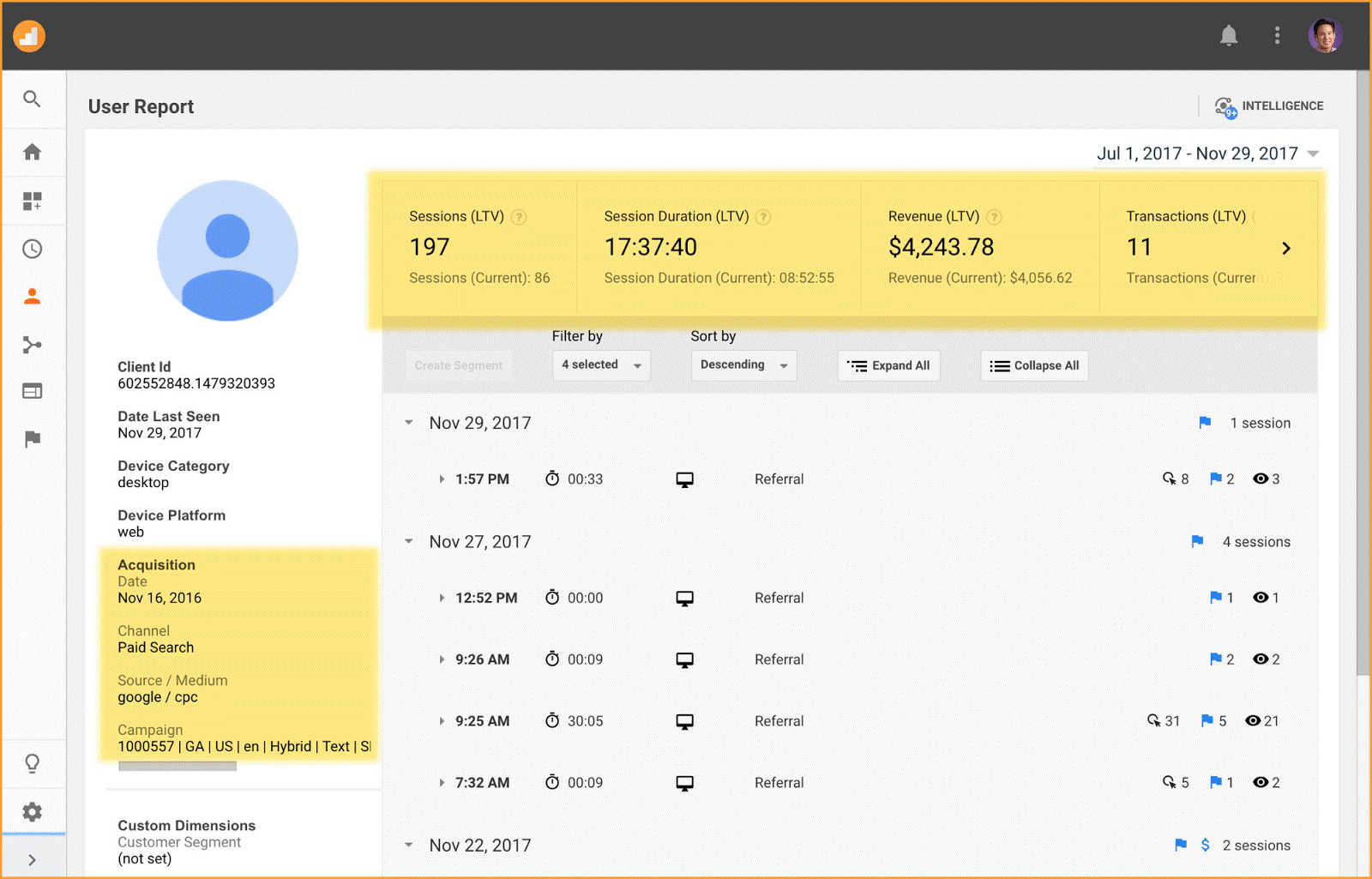 In het rapport gebruiksanalyse kon je eerder al op gebruikersniveau onder meer zien op welke momenten een gebruiker op je website kwam, hoe lang elke sessie was en welk apparaat de bezoeker gebruikte. Nu worden er ook nieuwe metrics en dimensies in dit rapport toegevoegd over de lifetime value van de bezoeker.
