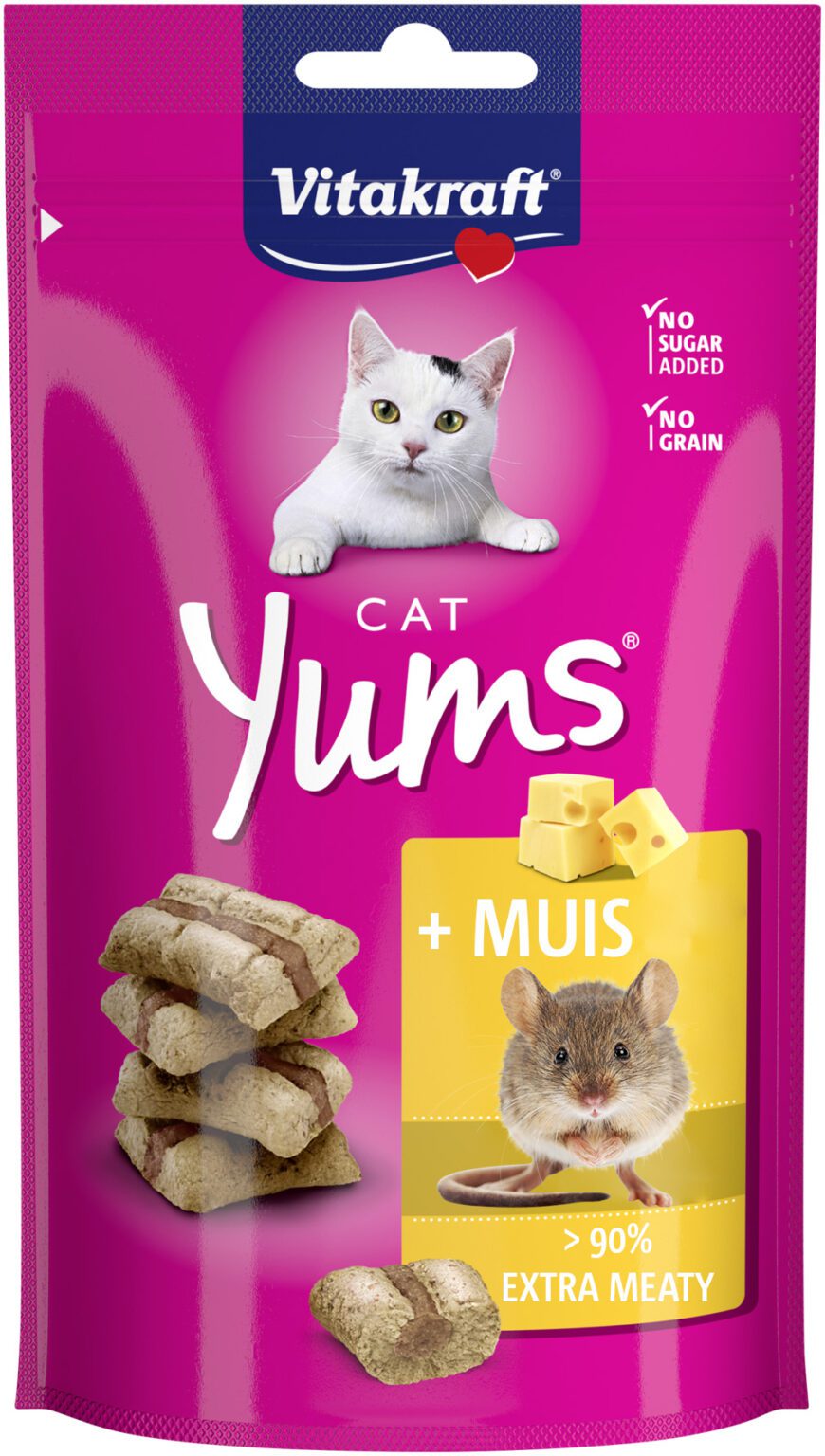 Is jouw kat een muizengek? Of weet hij of zij juist niet zo goed wat hij met een muis moet doen? Vitakraft Cat Yums muis zijn zachte snacks voor elke kat. Of hij nu van muizen houd of liever in de vensterbank ligt te slapen, met deze snack komt jouw kat gegarandeerd bij je kroelen. Samengevat: zachte vleessnack, extra vlezig (70%), lekkere, zichtbare vulling, bevat taurine, graanvrij, zonder toegevoegde suikers, zonder soja, in hersluitbare verpakking