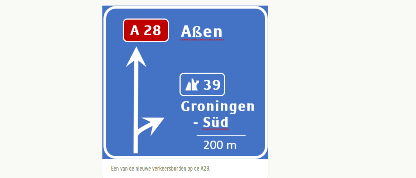 “Komend weekend is de A28 voor het derde en laatste weekend op rij dicht. We gaan hier zaterdag onder andere de definitieve nieuwe verkeersborden plaatsen voor het verkeer richting het zuiden. Door een misverstand hebben we per ongeluk Duitstalige borden besteld. We verwachten dat dit voor de weggebruikers geen grote problemen oplevert.” Hier de link naar het volledige bericht. Woordvoerder Kristien de Smid denkt dat de Groningers snel gewend zijn aan de Duitstalige borden. ‘Veel mensen in het Noorden rijden via Duitsland naar hun vakantiebestemming. Daar weten ze de weg vaak prima te vinden, dus dat zal hier ook wel lukken.’