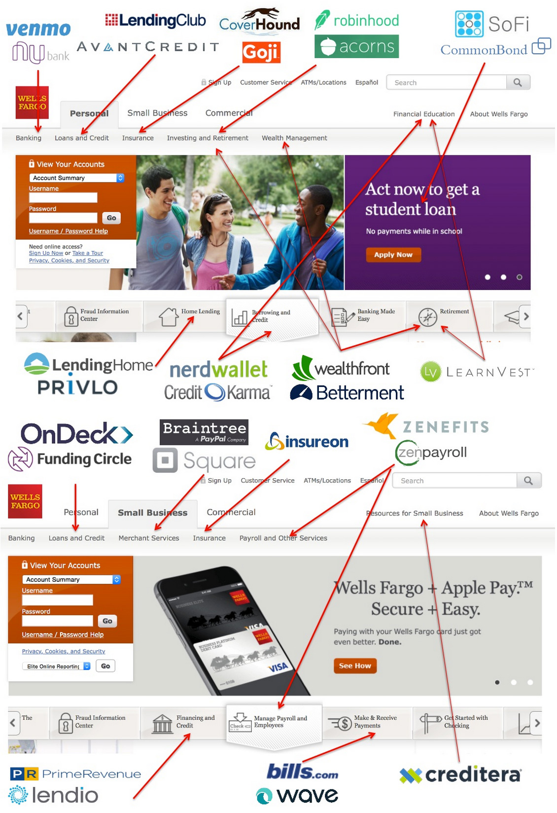 De zogeheten ‘nexus of forces‘ (de convergentie van social, mobile, analytics en cloud) zorgt ervoor dat iedereen snel en zonder al te hoge kosten bankje kan spelen. Tom Loverro toont dit op zijn blog eens te meer aan. Hij heeft zo’n exercitie uitgevoerd voor de bank WellsFargo. Door simpelweg te kijken naar de diensten die op de homepage worden aangeboden en deze te vervangen door diensten van nieuwe partijen, wordt in oogopslag duidelijk welk gevecht de banken de komende jaren moeten voeren.