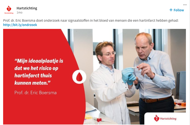 Is er binnen het zakelijke karakter van LinkedIn ruimte voor goede doelen? De Hartstichting laat zien van wel. Want juist een organisatie die zich actief beweegt tussen een grote verscheidenheid aan doelgroepen (donateurs, vrijwilligers, zorgverleners, wetenschappers, bedrijfsleven, patiënten en naasten), zoals de Hartstichting, heeft een groot belang bij aanwezigheid op LinkedIn om haar maatschappelijke positie en expertise op het gebied van hart- en vaatziekten te delen en zichtbaar te vergroten.