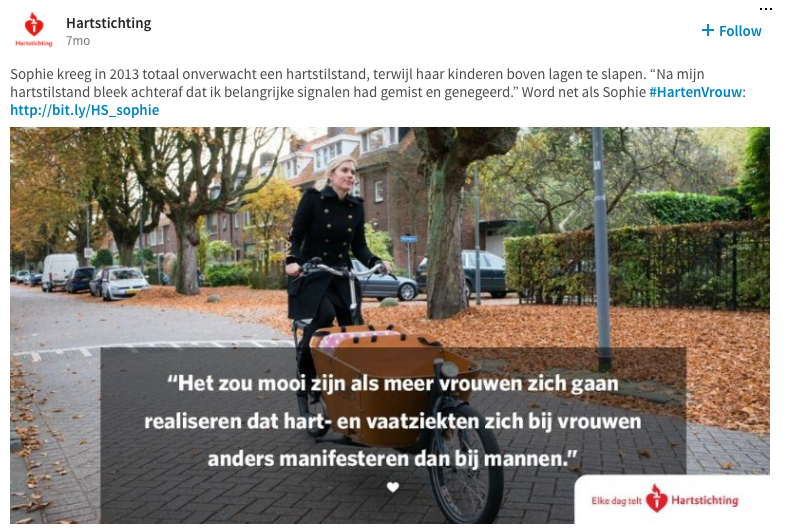 Waar veel goede doelen LinkedIn ‘erbij’ lijken te doen, kiest de Hartstichting ervoor dit platform volwaardig mee te nemen in haar kanalenmix. Er is een strategie ontwikkeld en al snel bleek dat een deel van de boodschap juist heel geschikt was voor het publiek op LinkedIn.