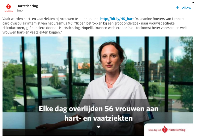 De meest succesvolle LinkedIn-campagne was de ‘Hartenvrouw’-campagne, waarin aandacht wordt gevraagd voor het feit dat hart- en vaatziekten doodsoorzaak nummer één is onder vrouwen. Het hoogtepunt van de campagne was Dress Red Day op 29 september, een dag die ook in ziekenhuizen en onder zorgprofessionals veel aandacht krijgt. Het is immers een thema waarmee ze in de praktijk regelmatig te maken krijgen.