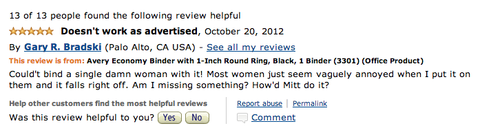 Het houdt niet op bij deze beeldgrappen. Inmiddels is Amazon zo ongeveer omgetoverd tot een forum waarop duizenden reviewers van multomappen laten weten of hun bij Amazon gekochte binder geschikt is voor het inbinden van vrouwen. Supercreatief en erg komisch om even te lezen dus.