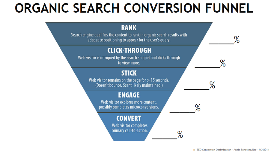 Te vaak gebeurt het dat mensen hun organische zoekverkeer op maar één of twee plekken optimaliseren. Leer om voor de gehele conversiefunnel te optimaliseren op gebruiker-/zoekopdracht-niveau: