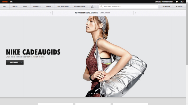 Nike doet dit heel goed: zoals je ziet, gebruiken ze een kleine header/navigatie. Op deze manier wordt de aandacht van gebruikers naar het product en de call to action getrokken.