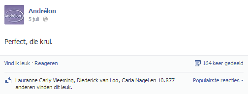 Duidelijk is dat ieder mens een mening heeft en dat is helemaal niet erg. Over één ding kunnen we het in ieder geval allemaal eens zijn: online inhakers brengen vaak veel teweeg. Een goede poging wordt op social media veel geliked, gedeeld en krijgt veel reacties. Zo kreeg de Andrélon Facebook-post ‘Perfect, die krul.’, na de heldenrol van keeper Tim Krul op het WK-voetbal, bijna 11.000 likes. De grap past perfect bij het merk, omdat Andrélon de ‘Perfecte Krul’-shampoo in haar assortiment heeft.