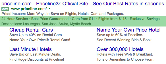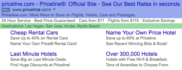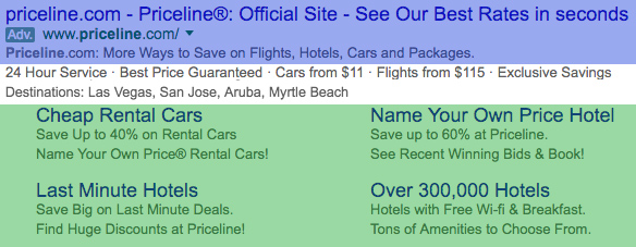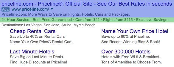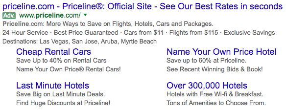 De AdWords-ad van Priceline ziet er nu heel anders uit, evenals de sitelinks. Voornamelijk door die sitelinks is de huidige Priceline-ad 2,7 keer groter dan die uit 2009.