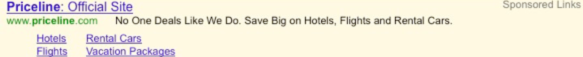 Naar de historische prestaties van advertentie-extensies kijken heeft niet zoveel zin. Onderstaande voorbeeld van priceline.com is van november 2009, toen sitelinks net nieuw waren.