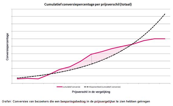 In het gearceerde roze gebied is het conversiepercentage hoger dan het cumulatieve conversiepercentage. De grijze lijn markeert het prijsniveau waarop het verschil tussen de cumulatieve en exponentiële conversie het grootst is. Opvallend is dat het conversiepercentage niet exponentieel stijgt. Zowel onder als boven een specifiek kortingsbedrag neemt het conversiepercentage af noch toe. Met andere woorden: vanaf een bepaald bedrag maakt de hoogte van de korting niet meer uit. Op basis van deze kennis kan een bedrijf het prijs/kortingsbeleid aanpassen om te voorkomen dat er onnodig veel korting wordt weggegeven.