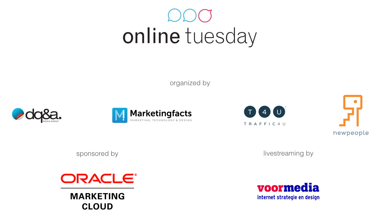 Online Tuesday is het maandelijkse event over online marketing dat wordt georganiseerd door Marketingfacts, Traffic4U, Newpeople en DQ&A Media Group en gesponsord door Oracle Marketing Cloud. De livestream en videoregistratie worden verzorgd door Voormedia.