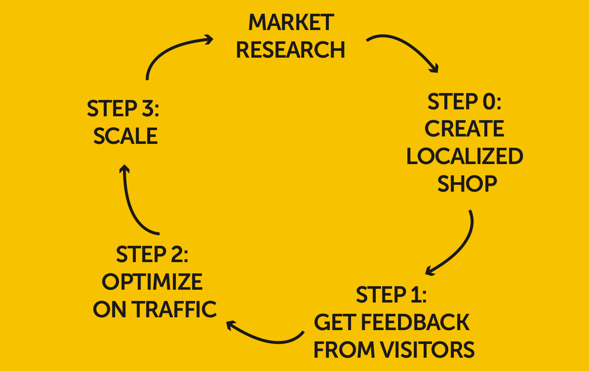 Vanuit de learnings uit de test bedacht Helloprint een stappenplan voor de lancering in een nieuw land. De bedoeling van dit model is dat één team zo snel mogelijk de stappen doorloopt om op deze manier zo snel mogelijk succesvol een lancering in een nieuw land te hebben.